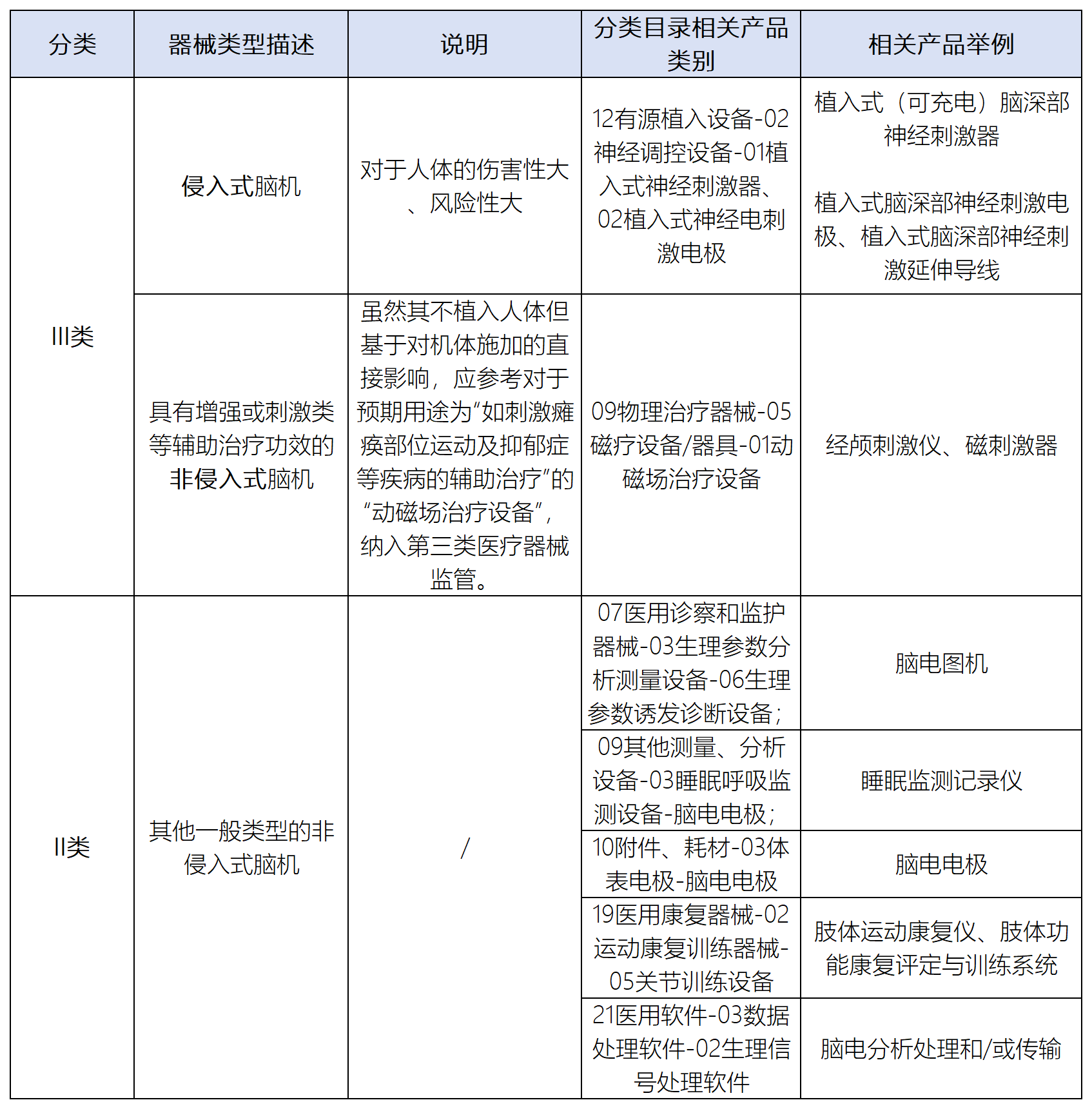 中國(guó)器審發(fā)布的《腦機(jī)接口的監(jiān)管現(xiàn)狀》指出,由于III類醫(yī)療器械在注冊(cè)難度、監(jiān)管要求、申請(qǐng)受理部門層級(jí)和申請(qǐng)時(shí)長(zhǎng)等方面都遠(yuǎn)高于II類醫(yī)療器械,我國(guó)腦機(jī)企業(yè)目前大多選擇非侵入式采集技術(shù)路線。對(duì)于侵入式腦機(jī)設(shè)備,目前都處在臨床性研究和動(dòng)物實(shí)驗(yàn)階段。目前暫無公開性的由國(guó)家藥品監(jiān)督管理局正式批準(zhǔn)進(jìn)入人體臨床試驗(yàn)階段的侵入式腦機(jī)器械。根據(jù)廣義BCI的定義,結(jié)合我國(guó)現(xiàn)行《醫(yī)療器械分類目錄》的規(guī)定,與BCI相關(guān)設(shè)備的分類主要為II類和III類: