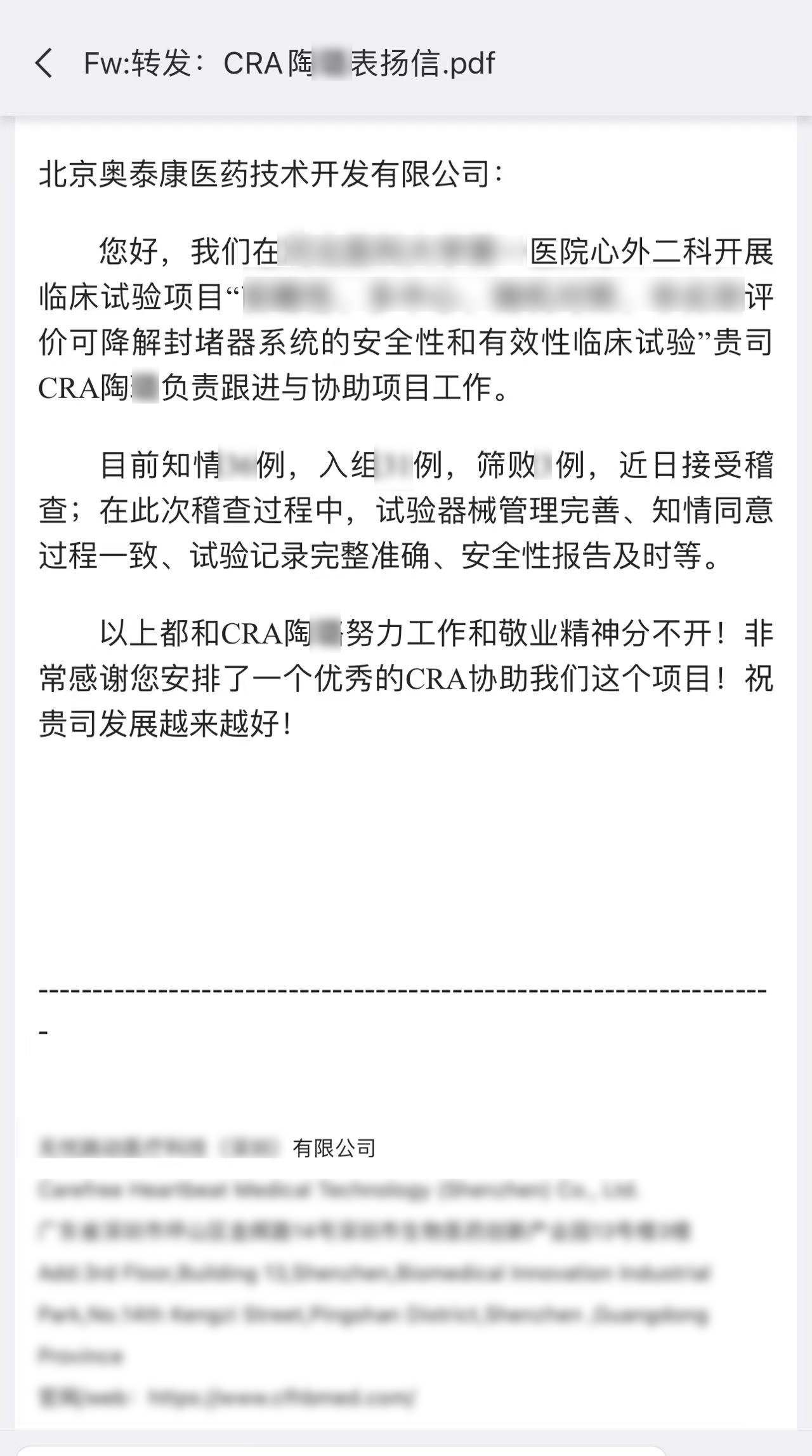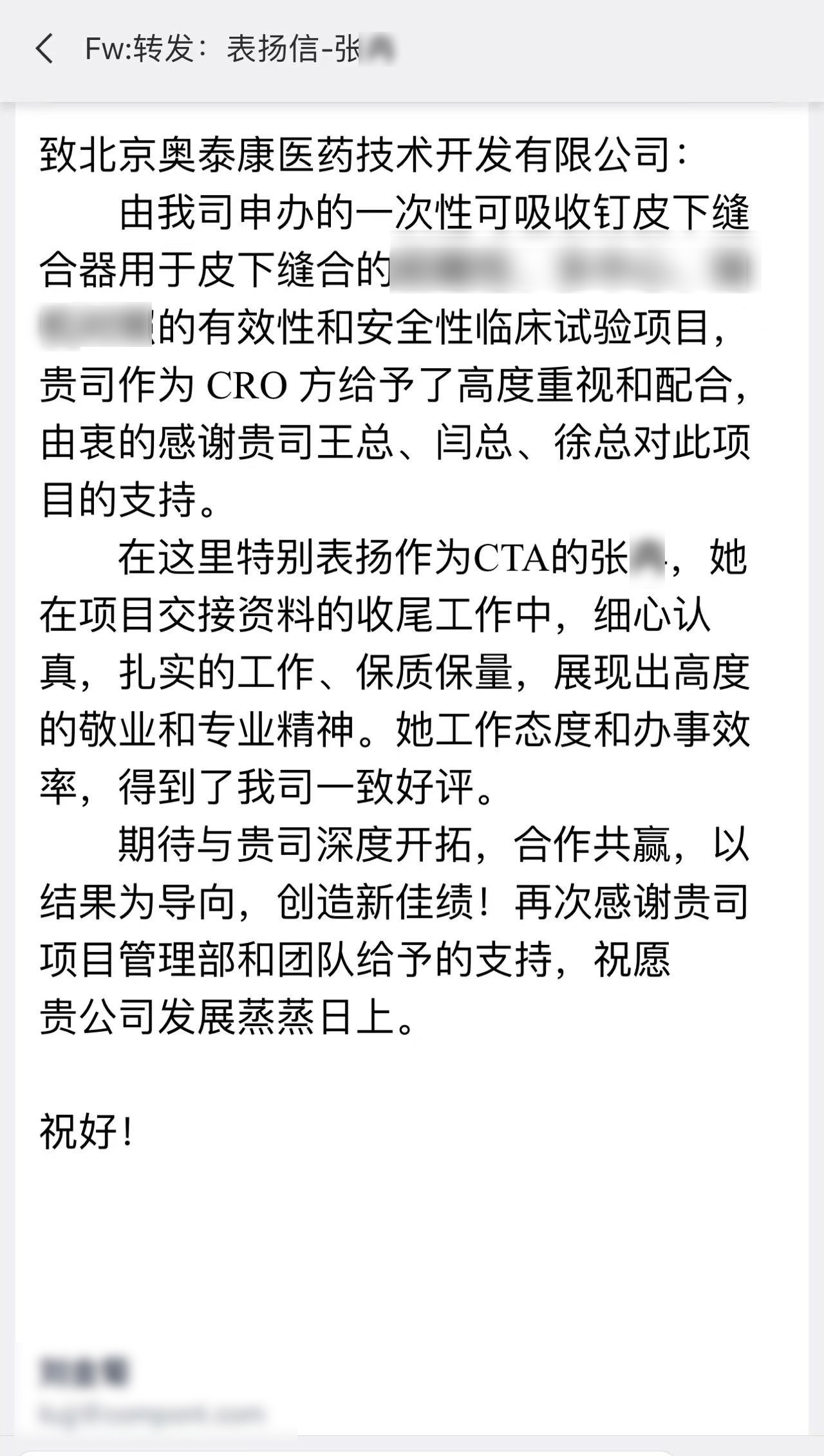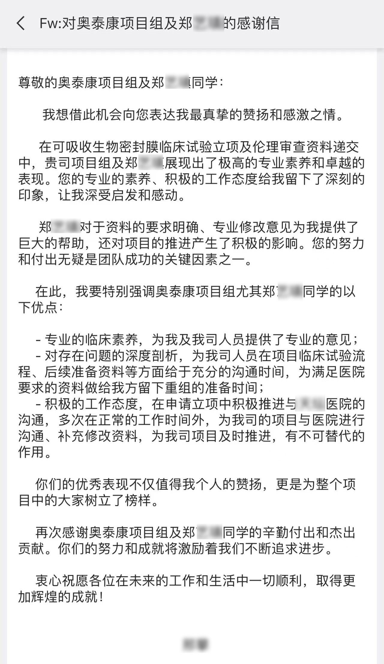 每一個項目的推進(jìn)離不開臨床團隊的共同努力,一年過半,奧泰康陸續(xù)收到了多封來自合作伙伴的感謝信和表揚信,信中對奧泰康人在臨床試驗項目中的表現(xiàn)給予高度肯定。我們也對他們致以由衷的敬意,感謝他們?yōu)橥七M(jìn)產(chǎn)品上市付出的不懈努力,讓我們共同查收這些信件吧~