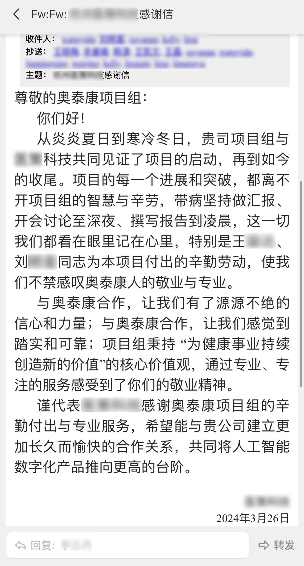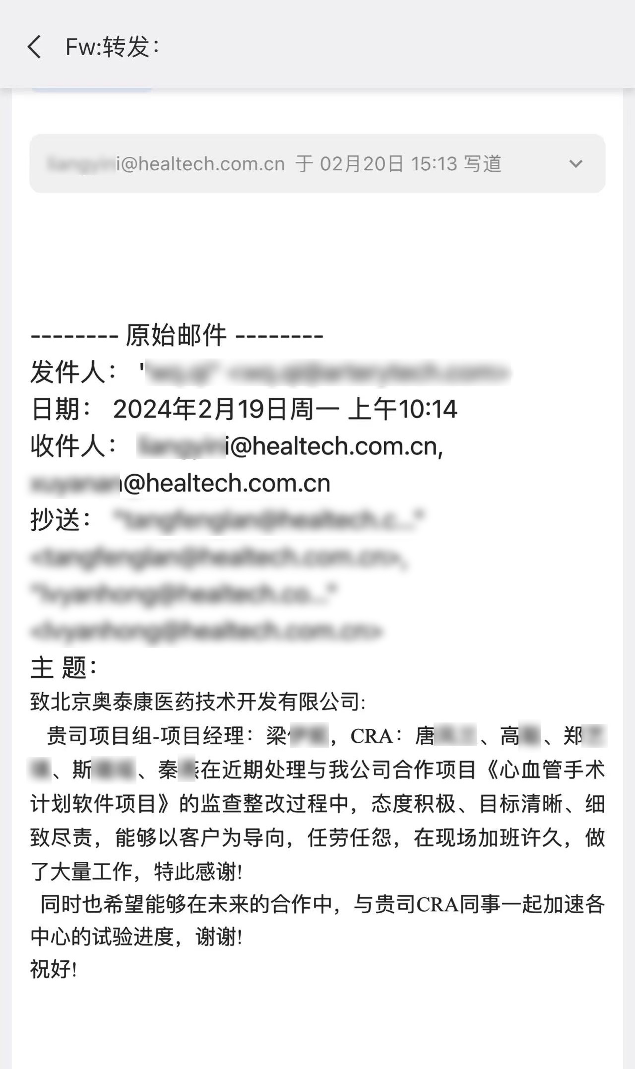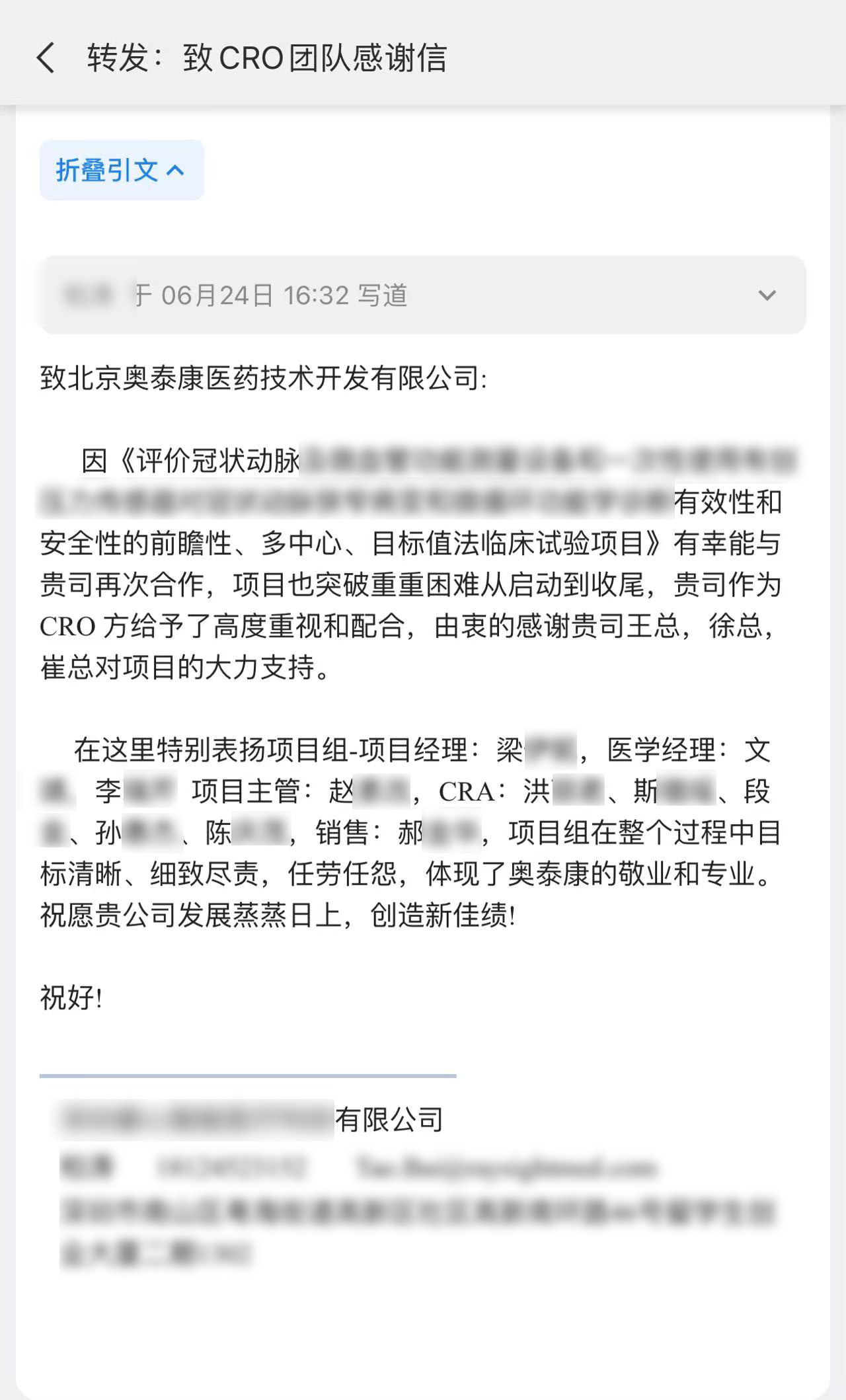 每一個項目的推進(jìn)離不開臨床團隊的共同努力,一年過半,奧泰康陸續(xù)收到了多封來自合作伙伴的感謝信和表揚信,信中對奧泰康人在臨床試驗項目中的表現(xiàn)給予高度肯定。我們也對他們致以由衷的敬意,感謝他們?yōu)橥七M(jìn)產(chǎn)品上市付出的不懈努力,讓我們共同查收這些信件吧~