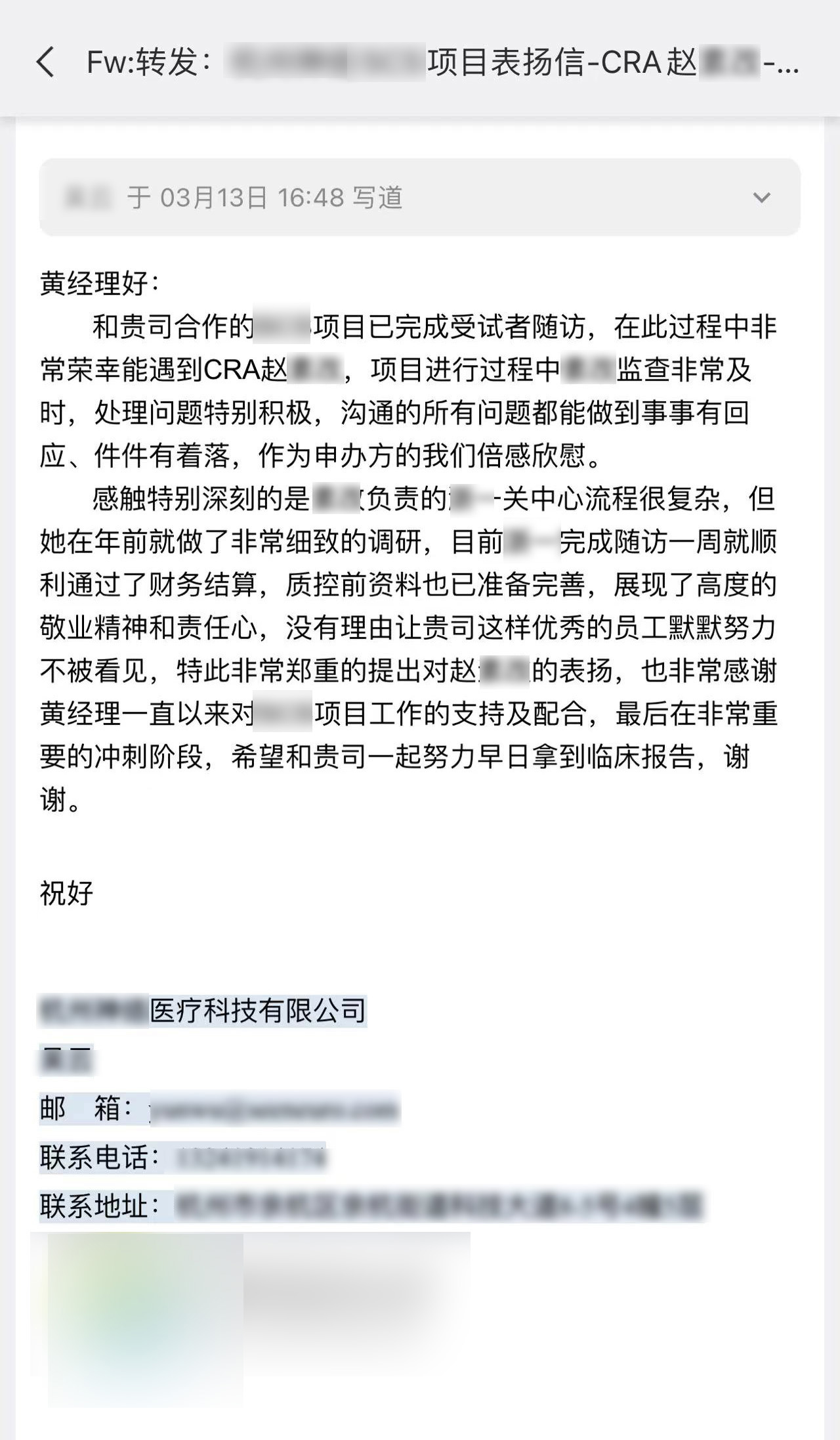 臨床資訊速遞實力點贊 ——來自臨床的感謝信&表揚信?? 一起查收吧~臨床試驗 作為人類追求生命健康過程中的重要一環(huán),照亮著醫(yī)學(xué)前行的道路,新藥和醫(yī)療器械通過臨床試驗,經(jīng)過科學(xué)的研究驗證其安全性和有效性之后,獲得批準(zhǔn)上市的資格,為臨床患者帶來健康和希望。是每一位參與臨床試驗的受試者、研究者、合作伙伴和醫(yī)療從業(yè)者共同的努力,使中國臨床試驗事業(yè)不斷向更高的臺階邁進(jìn)。