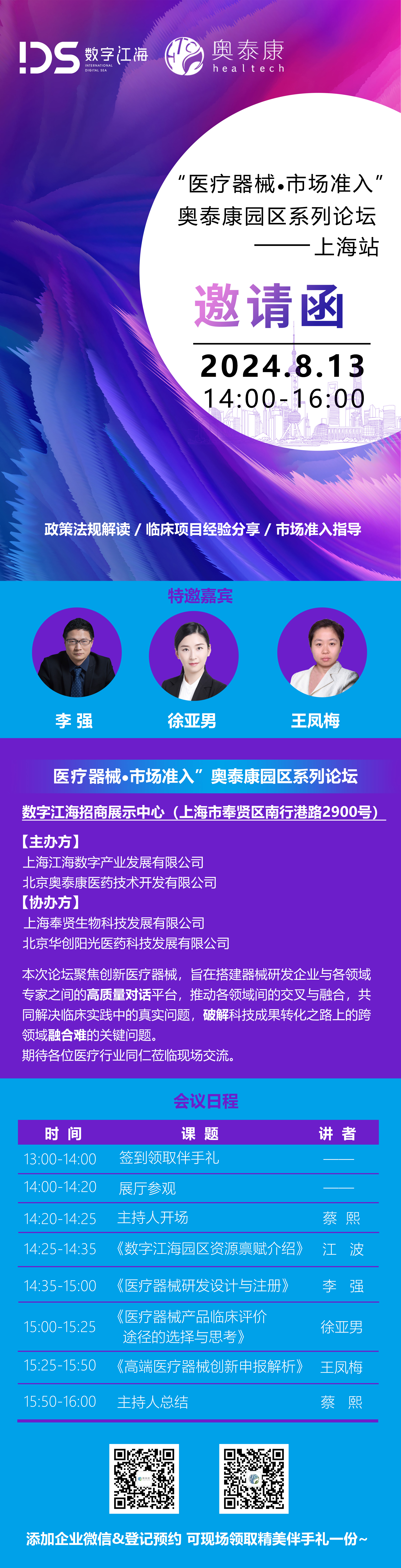 2024年8月13日(下周二),“醫(yī)療器械●市場(chǎng)準(zhǔn)入”奧泰康園區(qū)系列論壇將在上海召開,本次論壇主講嘉賓為數(shù)字江海產(chǎn)業(yè)發(fā)展事業(yè)部總監(jiān)江波、奧泰康蘇州CDMO中心負(fù)責(zé)人李強(qiáng)、臨床注冊(cè)部總監(jiān)徐亞男、項(xiàng)目運(yùn)營(yíng)中心注冊(cè)經(jīng)理王鳳梅,聚焦醫(yī)療器械市場(chǎng)準(zhǔn)入與大家展開交流探討。