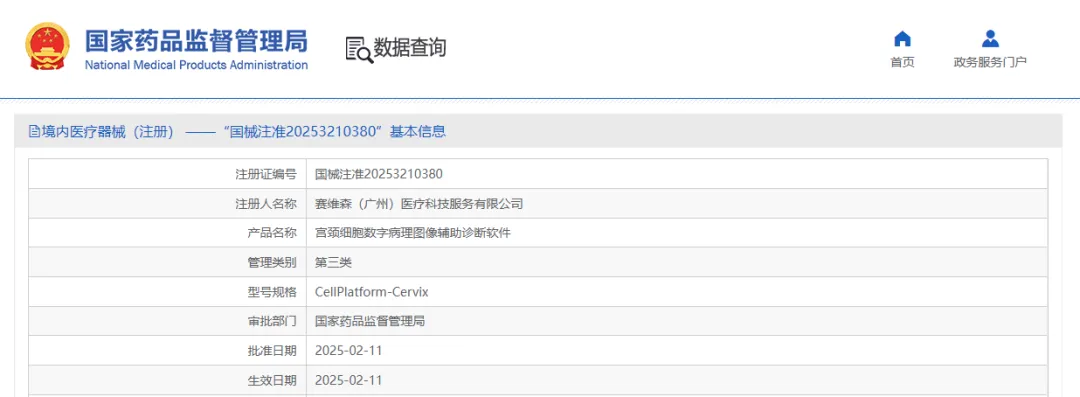 賽維森科技自主研發(fā)的“宮頸細(xì)胞數(shù)字病理圖像輔助診斷軟件”,正式獲得國(guó)家藥監(jiān)局(NMPA)頒發(fā)的第三類醫(yī)療器械注冊(cè)證,是宮頸細(xì)胞學(xué)領(lǐng)域首張“輔助診斷”三類證。人工智能正式升級(jí)為醫(yī)生的“超級(jí)助手”?。ㄗ?cè)證編號(hào):國(guó)械注準(zhǔn)20253210380)